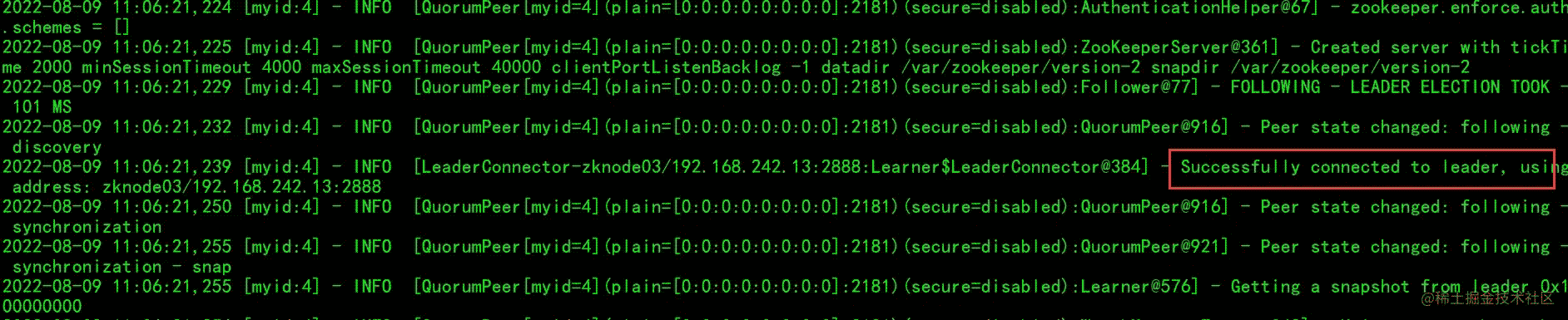 这个时候也会报 zknode04 连接不上(因为还没启动),但是整个zk集群已经启动了,并且选择了 zknode03 这个为leader。