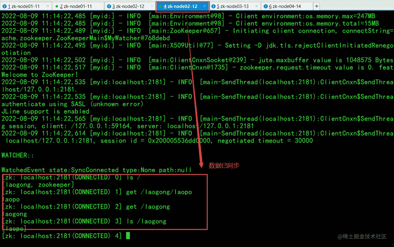 发现数据已经同步,zknode03 和 zknode04 数据也同步了。