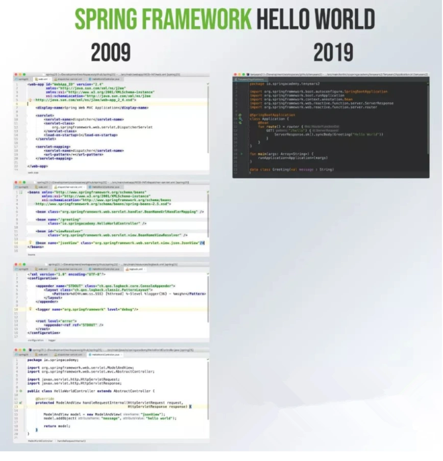 在spring boot出现以前,使用spring框架的程序员是这样配置web应用环境的,需要大量的xml配置。下图展示了在xml配置的时代和SpringBoot的配置量的差别。