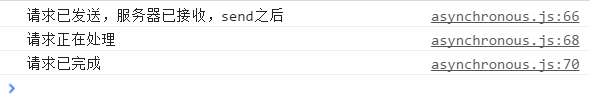 request.onreadystatechange=showResponse;在open之后send之前,当代码解析到request.onreadystatechange=showResponse;时,此时的readyStates=1(请求已和服务器建立接连),此后当readyStates由1变为2,回调函数showResponse加入任务队列中等待被执行,readyState从2变化到3,回调函数showResponse第二次加入任务队列,readyState从3变化到4,回调函数再次加入队列。所以猜想当主代码执行完毕后,控制台会输出“请求已发送,服务器已接收,send之后”,“请求正在处理”,“请求已完成”;确实如此: