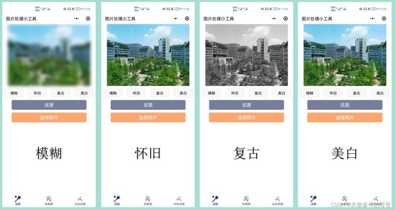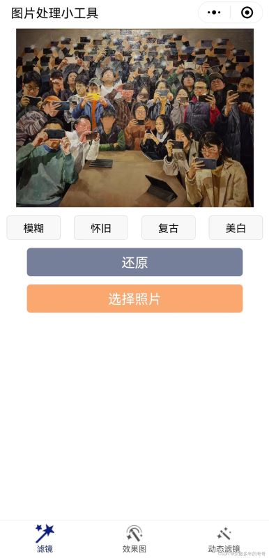 用户可以选择想要处理的图片,设置模糊、怀旧、复古、美白以及其他效果
