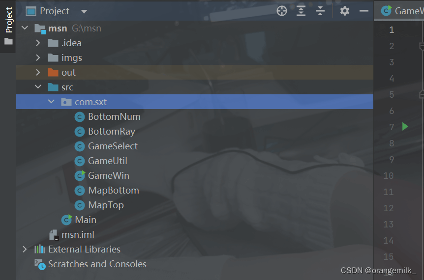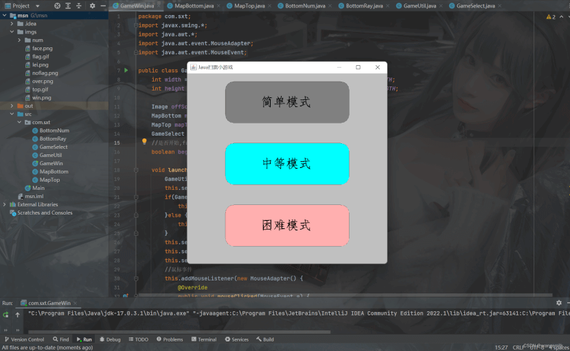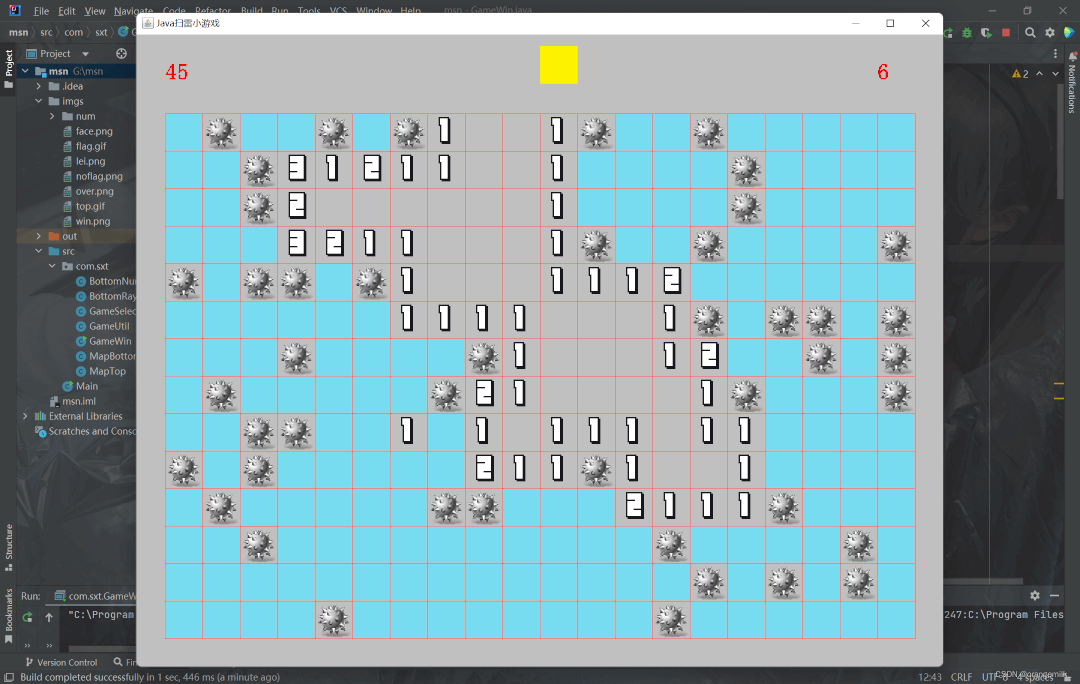 本程序共封装了六个类,分别是主类GameWin类,绘制底层地图和绘制顶层地图的类MapBottom类和MapTop类,绘制底层数字的类BottomNum类,以及初始化地雷的BottomRay类和工具GameUtil类,用于存静态参数和方法,最后用于难度选择的方法封装在GameSelect类中。