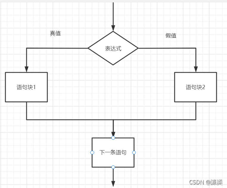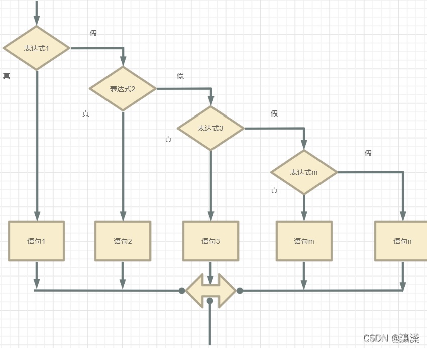 ①→判断条件语句 1 是否为 Ture(真),如果为 Ture 就执行语句块1,其它的语句块并不会执行。因此整个条件结构语句执行完毕。则继续执行其它的语句,如果条件语句1为False(假),则判断条件语句2是否为真。