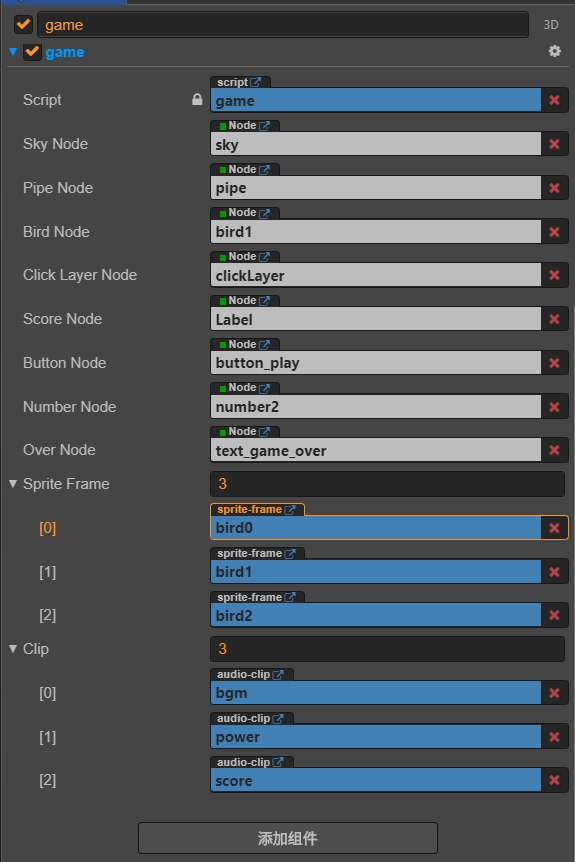 default: [],//数组类型,将会绑定bird0、bird1、bird2三张图片精灵,通过在update()方法中不断更换,形成动画