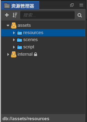 然后你需要在资源管理中创建项目中最重要场景、脚本文件,以及导入游戏所需要的纹理(图片资源)。这里的文件夹不是默认创建的,你需要手动创建,便于管理你的项目。需要说明的是resources是CocosCreator(以下简述cocos)中特殊的资源文件夹,所有需要通过cc.loader.loadRes动态加载(后续会提到这个方法)的资源,都必须放置在resources文件夹和它的子文件夹下。如果一份资源仅仅是被resources中的其他资源所依赖,而不需要直接被cc.loader.loadRes调用,就不需要放在resources文件夹里。