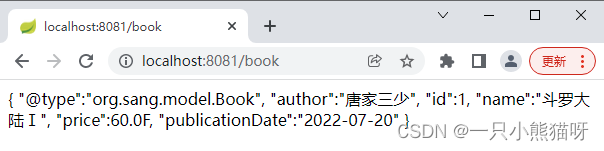 BookController 跟 使用Gson的 BookController 一致即可,此时在浏览器中输入"http://localhost:8081/book",查看返回结果,如图: