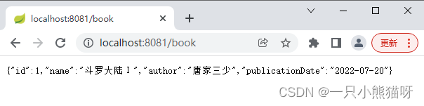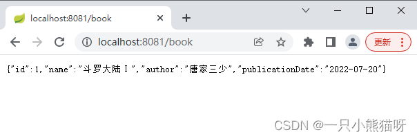 }此时在浏览器中输入"http://localhost:8081/book",即可看到返回了JSON数据,如图: