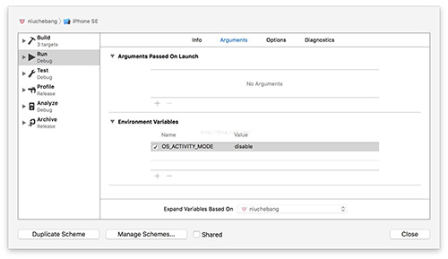 刚把Xcode更新到最新的8,一运行发现好多log输出,根据如下操作可以关掉这些log日志,点击项目Edit Scheme - Run - Arguments - Environment Variables里添加:Name:OS_ACTIVITY_MODE Value:disable