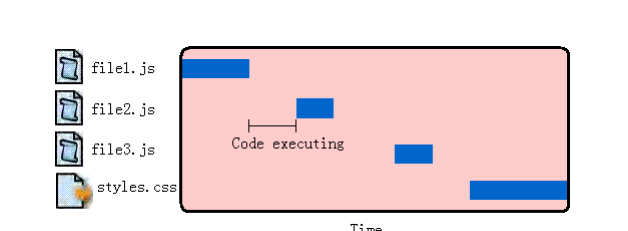 这种情况无疑是存在严重的性能问题的,由于脚本会阻塞页面的渲染,直到它们全部下载并执行完成后,页面渲染才会继续,下面的图就是代码的执行顺序