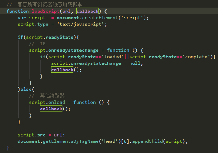 在主流的浏览器会在<script>标签接收完成时触发一个load事件,但是ie浏览器没有,所以我们必须封装一个兼容所有的浏览器都可以使用的方法