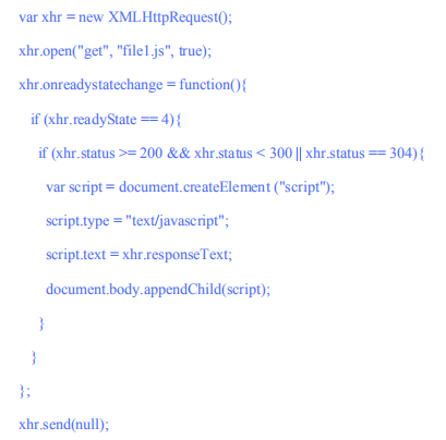 这种技术的重点在于:无论在何时启动下载,文件的下载和执行过程不会阻塞页面其他进程,但是使用动态脚本节点下载js文件时,返回的代码会立即执行(除了Firefox和Opera,它们会等待此前所有动态脚本节点执行完毕)