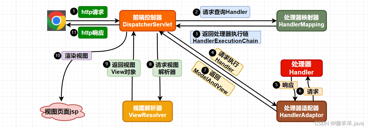 ⑩DispatcherServlet根据View进行渲染视图〈即将模型数据填充至视图中),DispatcherServlet响应用户