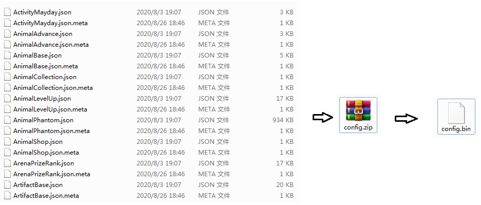 将游戏的配置文件,多个json,压缩成zip包,并将后缀zip改为bin,放在resources/config下