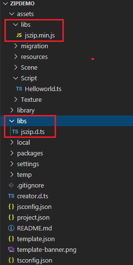 将下载的jszip.min.js放在项目assets/libs下,将jszip.d.ts放在项目根目录的libs下。 (jszip.d.ts在demo中)