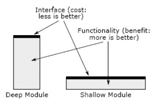 长方形的面积大小和模块实现的功能多少成比例。顶部边代表模块的接口,边的长度代表它的复杂度。最好的模块是深的:他们有很多功能隐藏在简单的接口后。深模块是好的抽象,因为它只把自己内部的一小部分复杂度暴露给了用户。