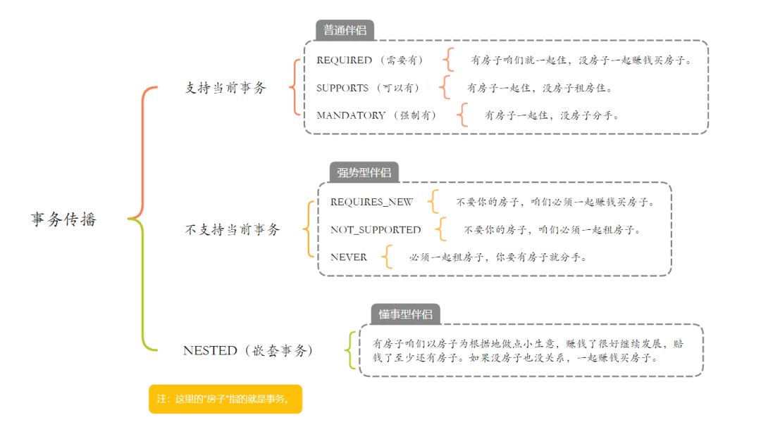 最后一种是嵌套性事务 Propagation.NESTED,它属于懂事型女友,如果有房子了就以房子为基础做点小生意,卖个花生、水果啥的,如果买卖成了,那就继续发展;如果失败了,至少还有房子;如果没房子也没关系,一起赚钱买房子。