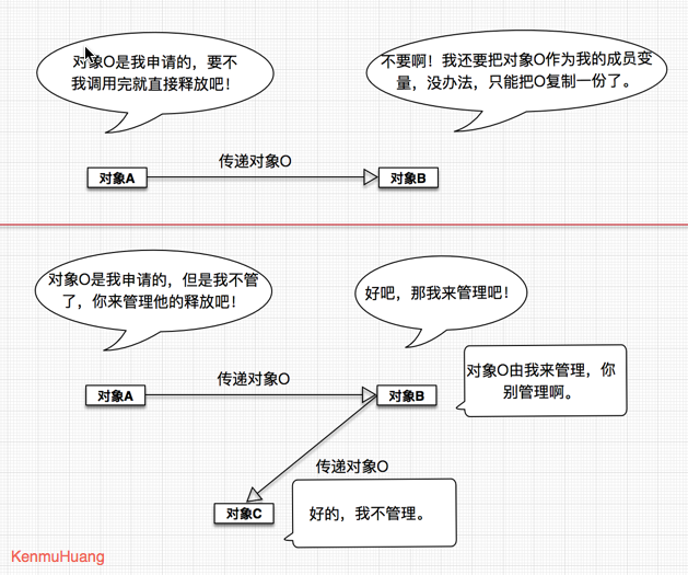 (2)对象 A 只负责生成对象 O,之后就由对象 B 负责完成对象 O 的销毁工作。如果对象 B 只是临时用一下对象 O,就可以用完后马上销毁,如果对象 B 需要长时间使用对象 O,就不销毁他。这种做法看似解决了对象复制的问题,但是他强烈依赖于 A 和 B 两个对象的配合,代码维护者需要明确地记住这种编程约定。而且,由于对象 O 的生成和释放在不同对象中,使得他的内存管理代码分散在不同对象中,管理起来也很费劲。如果这个时候情况更加复杂一些,例如对象 B 需要再向对象 C 传递参数对象 O,那么这个对象在对象 C 中又不能让对象 C 管理。所以这种方法带来的复杂度更高,更加不可取。