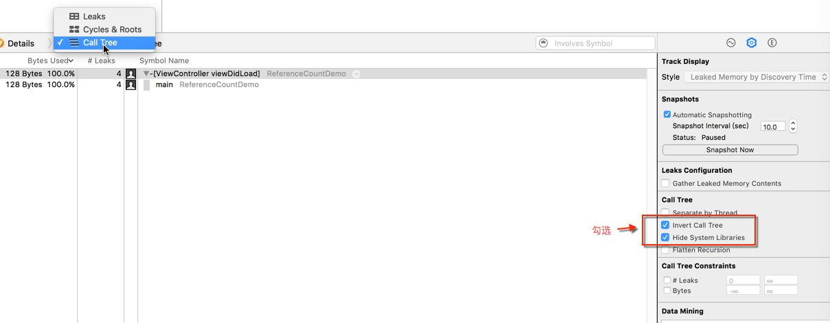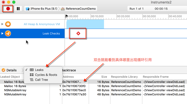 然后选择「Leaks」,再单击右下角的「Choose」按钮进入检测界面,这时点击左上角的「Record」红色圆点按钮开始检测。
