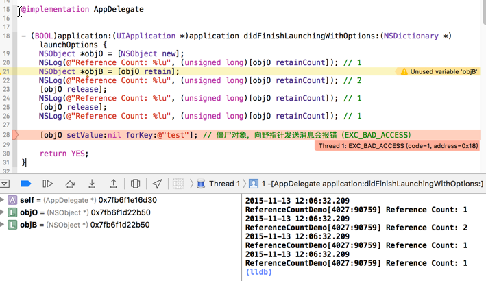从上面简单例子,我们还看不出引用计数真正的用处,因为该对象的生命周期只是在一个方法内。在真实的应用场景中,我们在方法内使用临时对象,通常不需要修改他的引用计数,只需要在方法返回前销毁对象就可以了。