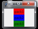 from tkinter import * root = Tk() #创建三个 Label 分别添加到root窗体中 #Label是一种用来显示文字或者图片的组件 Label(root,text = 'pack1',bg = 'red').pack() Label(root, text = 'pack2', bg = 'blue').pack() Label(root, text = 'pack3', bg = 'green').pack() root.mainloop()