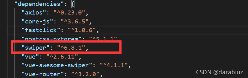 Vue.use(VueAwesomeSwiper, /* { default options with global component } */)去到package.json里面查看安装的swiper的版本号,为7.x版本