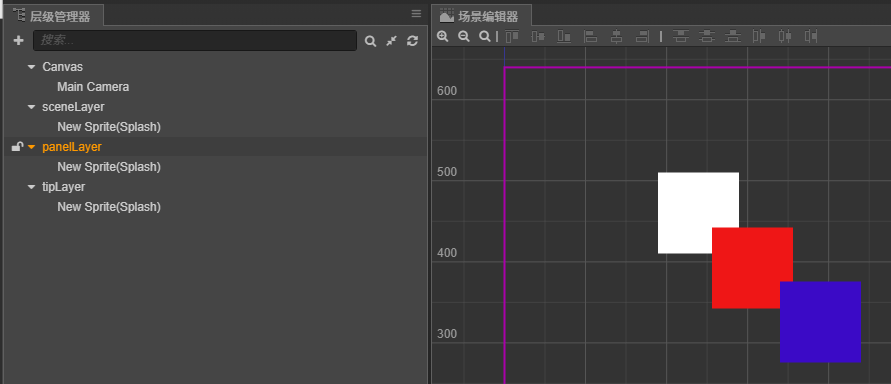 比如我在场景1,放置sceneLayer等图层。为了方便显示,我每个图层加了个单色。