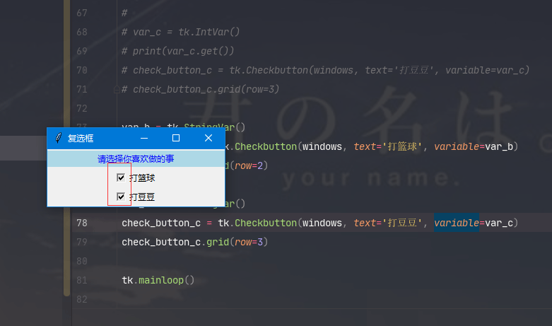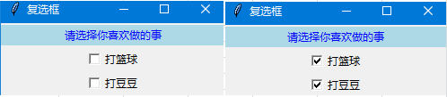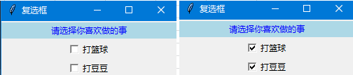 var_b = tk.StringVar() check_button_b = tk.Checkbutton(windows, text='打篮球', variable=var_b) check_button_b.grid(row=2) var_c = tk.StringVar() check_button_c = tk.Checkbutton(windows, text='打豆豆', variable=var_c) check_button_c.grid(row=3) tk.mainloop()