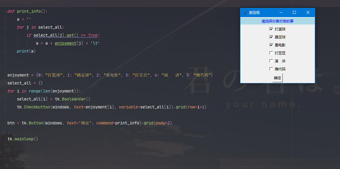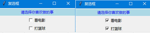 check_button_a = tk.Checkbutton(windows, text='看电影') check_button_a.grid(row=1) check_button_b = tk.Checkbutton(windows, text='打篮球') check_button_b.grid(row=2) tk.mainloop()