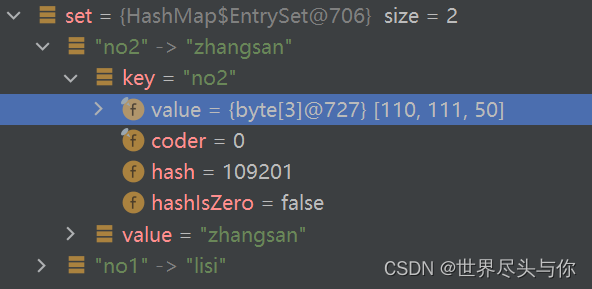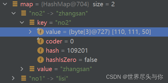 通过debug,我们先来看一下Map中存放的数据,其no2这个键的地址是@727