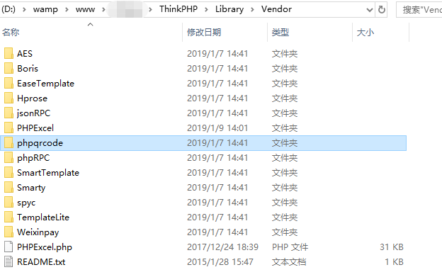 (1)从网上下载下phpqrcode插件包,将它放到thinkphp的文件里,路径如下:ThinkPHP\Library\Vendor ,截图如下: