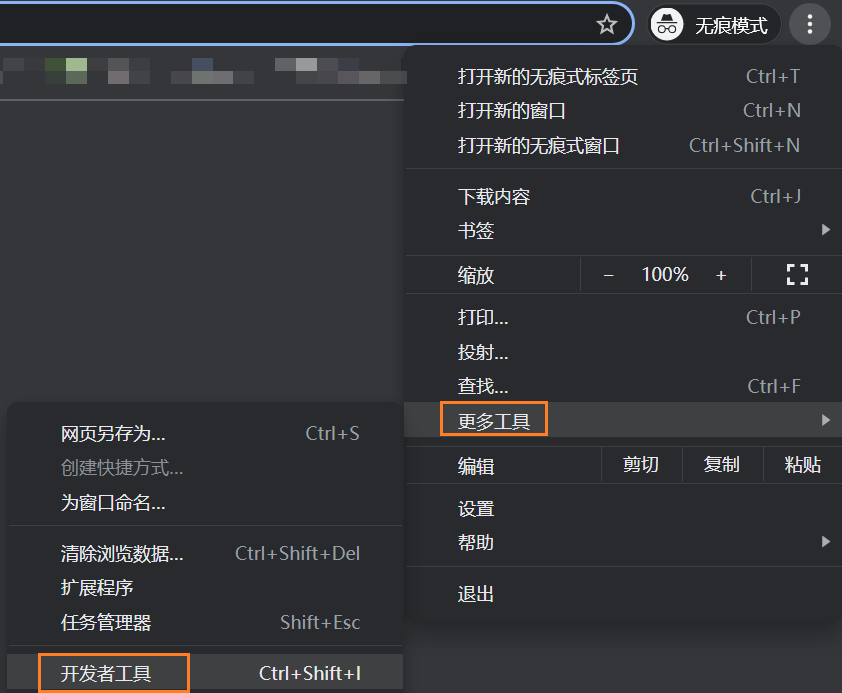 依次从右上角菜单栏中选择 更多工具 -> 开发者工具 开启。当然,这里也可以看到,其实我们也可以通过另一组快捷键来开启(Ctrl Shift I)。如果你对 Chrome 足够熟悉,那么这也是一种可选的方式。