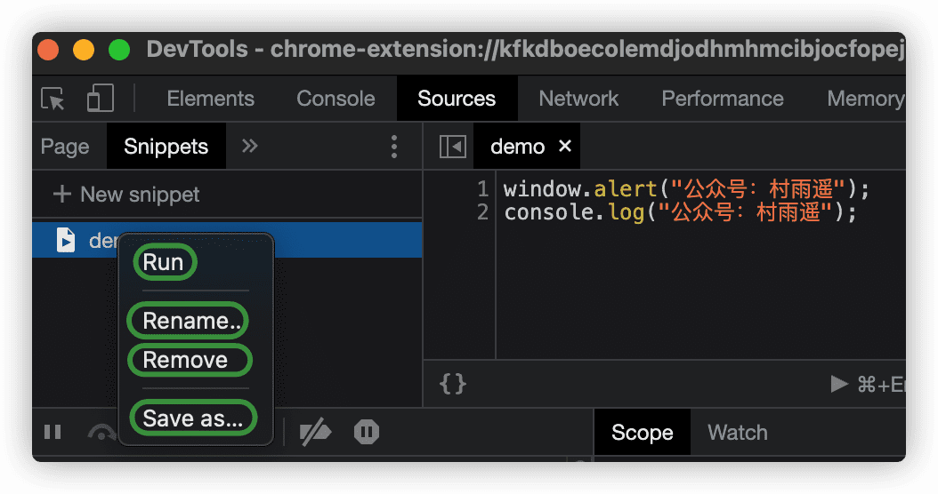 以下是两个实例,第一个实例将会在控制台中打印公众号:村雨遥,而第二个实例则会在浏览器中弹窗并显示公众号:村雨遥。
