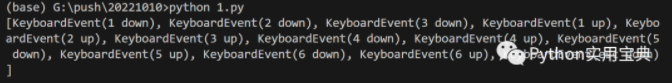 # 公众号:Python实用宝典 import keyboard recorded = keyboard.record(until='esc') print(recorded)