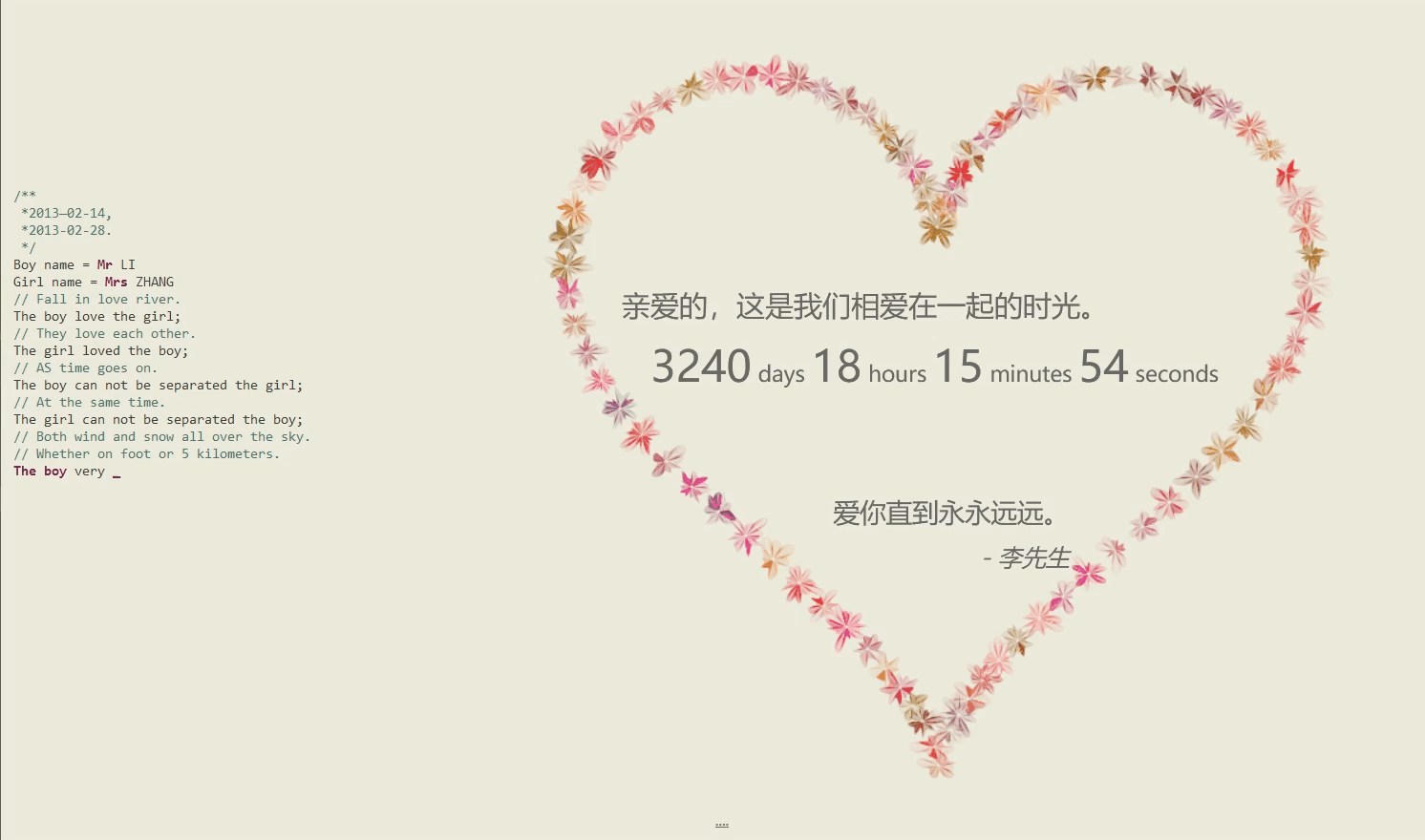 <link href="css/default.css" rel="external nofollow" type="text/css" rel="stylesheet"> <script type="text/javascript" src="js/jquery.js"></script> <script type="text/javascript" src="js/garden.js"></script> <script type="text/javascript" src="js/functions.js"></script> </head> <body> <div id="mainDiv"> <div id="content"> <div id="code"> <span class="comments">/**</span><br /> <span class="space"/><span class="comments">*2013—02-14,</span><br /> <span class="space"/><span class="comments">*2013-02-28.</span><br /> <span class="space"/><span class="comments">*/</span><br /> Boy name = <span class="keyword">Mr</span> LI<br /> Girl name = <span class="keyword">Mrs</span> ZHANG<br /> <span class="comments">// Fall in love river. </span><br /> The boy love the girl;<br /> <span class="comments">// They love each other.</span><br /> The girl loved the boy;<br /> <span class="comments">// AS time goes on.</span><br /> The boy can not be separated the girl;<br /> <span class="comments">// At the same time.</span><br /> The girl can not be separated the boy;<br /> <span class="comments">// Both wind and snow all over the sky.</span><br /> <span class="comments">// Whether on foot or 5 kilometers.</span><br /> <span class="keyword">The boy</span> very <span class="keyword">happy</span>;<br /> <span class="keyword">The girl</span> is also very <span class="keyword">happy</span>;<br /> <span class="placeholder"/><span class="comments">// Whether it is right now</span><br /> <span class="placeholder"/><span class="comments">// Still in the distant future.</span><br /> <span class="placeholder"/>The boy has but one dream;<br /> <span class="comments">// The boy wants the girl could well have been happy.</span><br /> <br> <br> I want to say:<br /> Baby, I love you forever;<br /> </div>