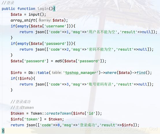 return json([ ' code '=>0, ' msg'=>'登录成功", ' result'=>$info]);