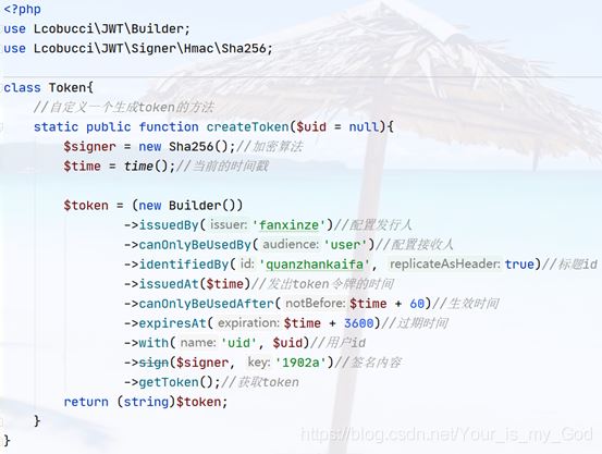 ->identifiedBy( id: ' quanzhankaifa',replicateAsHeader: true)//标题id->issuedAt($time)//发出token令牌的时间