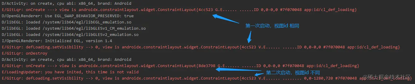 所以,真相只有一个,日志输出的视图 和 Layout Inspector 看到的的视图,肯定不是同一个!!为了验证这一点,代码再做如下调整,分别在 onCreate() 和 onLoadFail 中打印默认 Loading 视图信息:
