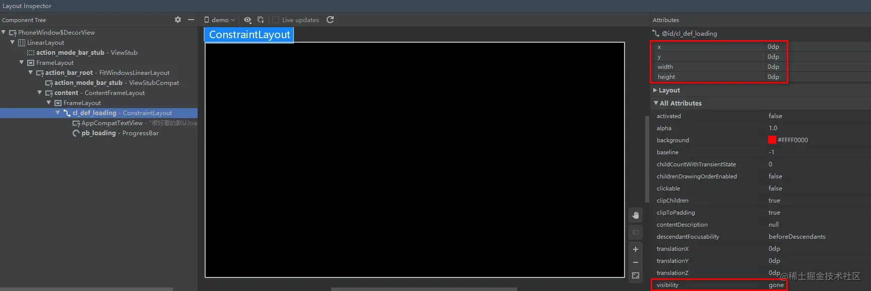 这时,使用 Layout Inspector(菜单栏 -> Tools -> Layout Inspector),获取到 LoadingActivity 的布局信息: