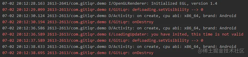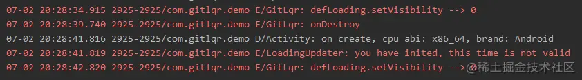 控制台日志信息也如期输出,第二次启动确实执行了 setVisibility(View.VISIBLE):