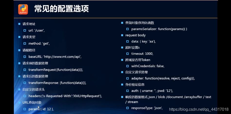 data(常用) data选项是作为一个请求体而需要被发送的数据,该选项只适用于方法:put/post/patch - 在浏览器上data只能是FormData, File, Blob格式