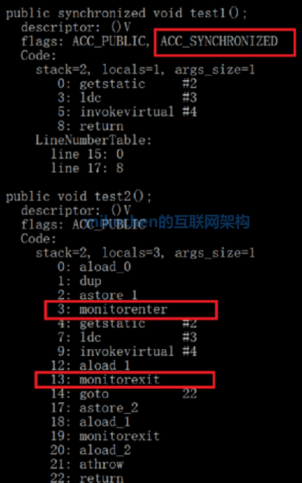 上图是syncrhoized同步代码块反编译截图,可以很清楚的看见,主要就是通过锁对象的monitor的取用(monitorenter)与释放来(monitorexit)实现的。