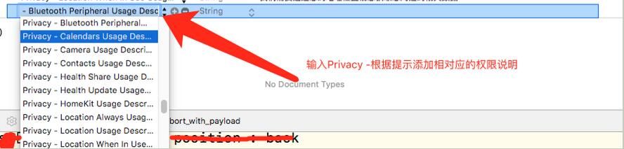 定位权限: Privacy - Location Always Usage Description 我们需要通过您的地理位置信息获取您周边的相关数据