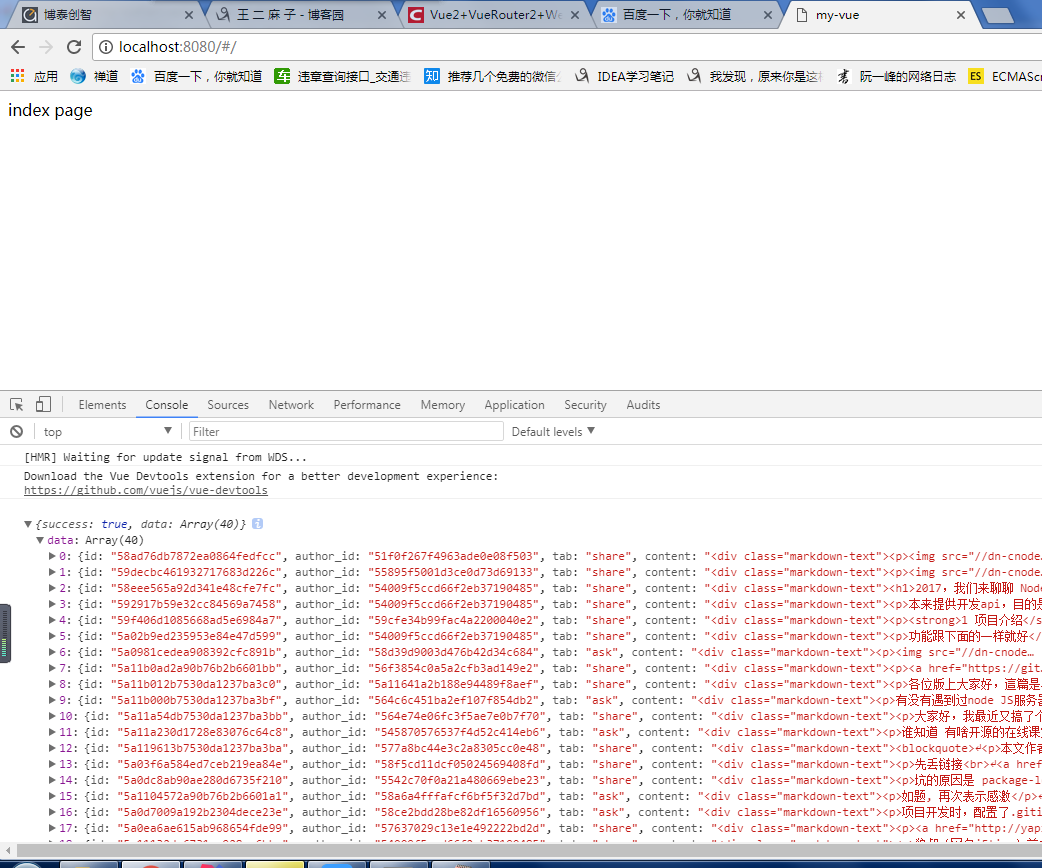 </script>我们在Index.vue中向浏览器的控制台输入一些接口请求到的数据,如果你和我也一样,那说明我们的接口配置完成正确。如下图: