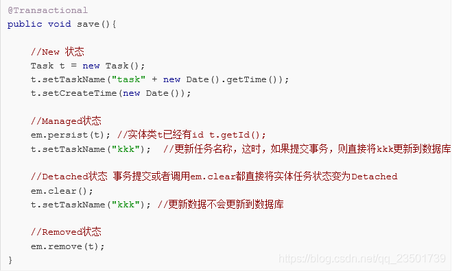 Managed状态下的数据保存,更新以及删除数据下的Removed状态,数据都不会立即更新到数据库,只有当你事务提交或者em.flush(),才会立即更新到数据库。 -