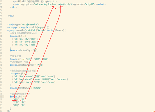 <select ng-options="value as key for (key , value) in obj3" ng-model="scity01"></select>