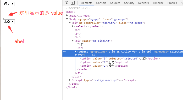 现在引入 angular 使用 ng-options 指令来生成一个下拉框,看下生成页面的代码