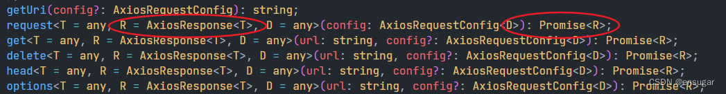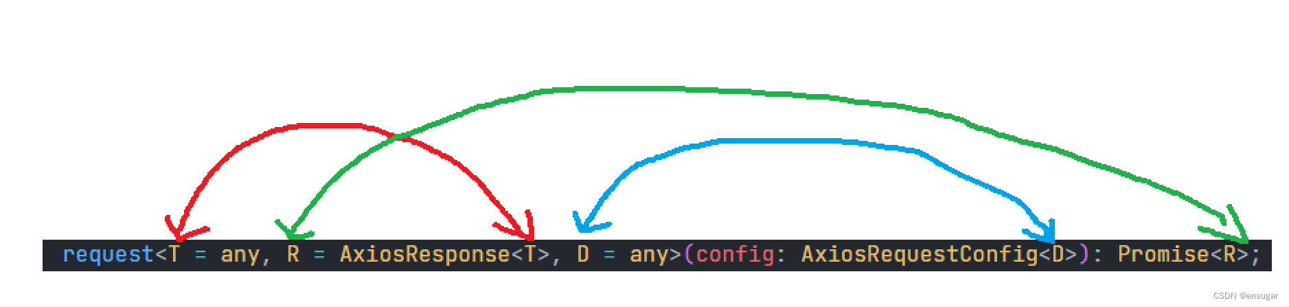 request函数的第一个泛型T指定了第二个泛型AxiosResponse接口中data的类型。第二个泛型R默认为AxiosResponse,指定了request函数返回的promise实例成功的回调函数的第一个参数的类型。第三个泛型D指定了请求配置对象中data的数据类型。(看不懂的话,请再结合第②③点再看一次)