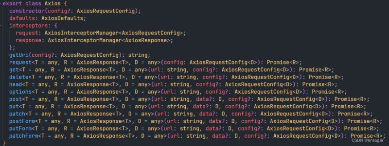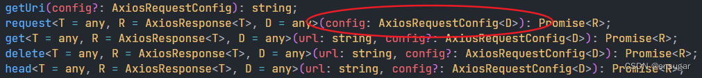从图中可知AxiosRequestConfig是axios请求配置对象的接口,例如下面的代码,axios函数的第一个参数就是AxiosRequestConfig接口的实例。而泛型D则是请求配置对象(axios函数的第一个参数)中data的类型,默认类型为any,因为AxiosRequestConfig接口内容太多就不列出来了。