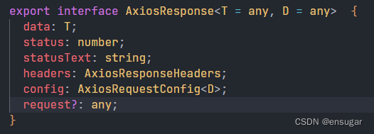 从下图可知,AxiosResponse接口第一个泛型参数T,泛型T就是AxiosResponse接口中data的数据类型,默认类型为any,也就是上图response.data的类型。第二个泛型参数和请求配置对象一样,是AxiosRequestConfig接口中data的类型,默认类型为any。