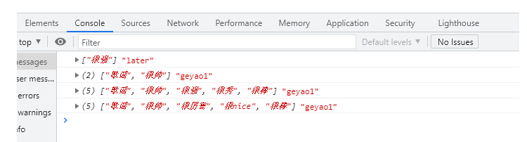 const geyao=["歌谣","很强","很帅"] // 从索引 1 开始删除 1 个元素 let b=geyao.splice(1,1) console.log(b,"later") console.log(geyao,"geyao1") // 从索引 2 开始 // 删除 0 个元素 // 然后插入 "很强" 和 "很秀" geyao.splice(2,0,"很强","很秀","很棒") console.log(geyao,"geyao1") //替换操作:执行替换操作时,第二个参数为要被替换的元素个数, 后面跟上要替换的deleteCount个元素即可; geyao.splice(2,2,"很厉害","很nice") console.log(geyao,"geyao1")